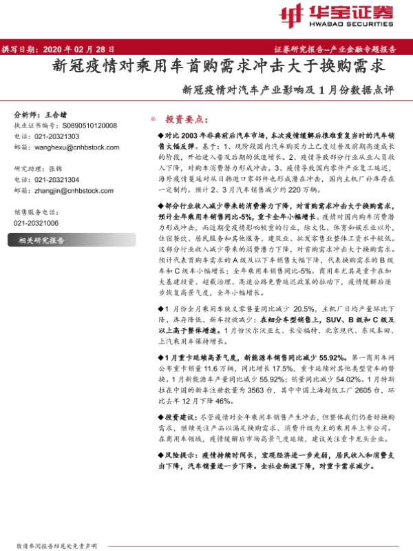 【华宝证券】【20200228】新冠疫情对汽车产业影响及1月份数据点评:新冠疫情对乘用车首购需求冲击大于换购需求-16页 行业研究