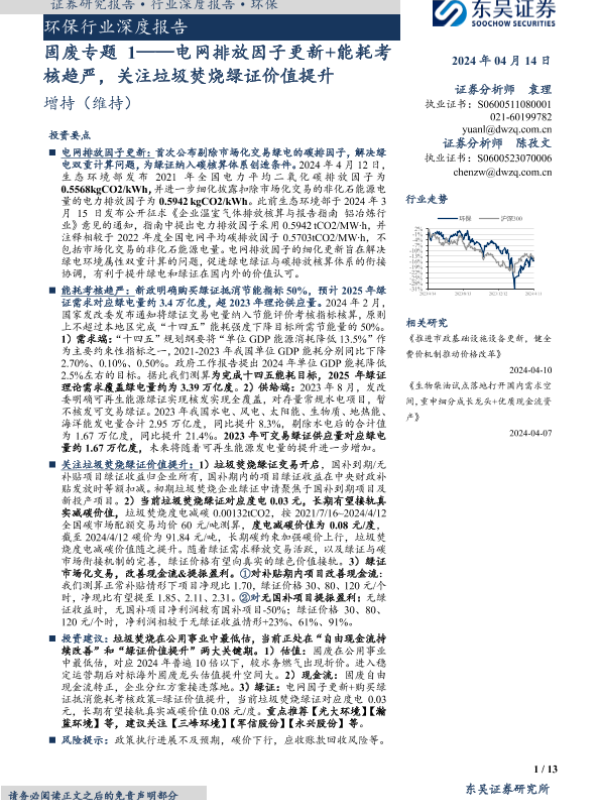 【东吴证券】【20240414】环保行业深度报告-固废专题1——电网排放因子更新+能耗考核趋严-关注垃圾焚烧绿证价值提升-13页 行业研究