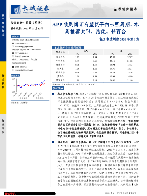 【长城证券】【20200113】轻工制造周报2020年第1期:APP收购博汇有望抚平白卡强周期,本周推荐太阳、洁柔、梦百合-34页 行业研究