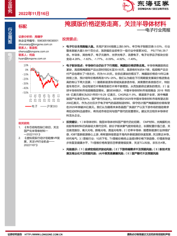 【东海证券】【20221116】20221116-东海证券-电子行业周报:掩膜版价格逆势走高,关注半导体材料-11页 行业研究