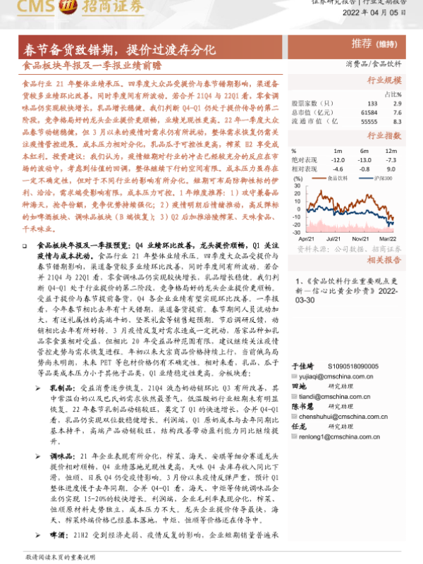 【海通证券】【20220405】食品板块年报及一季报业绩前瞻:春节备货致错期,提价过渡存分化-12页 证券期货研究报告