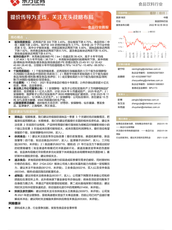 【东方证券】【20220209】20220209-东方证券-食品行业周报:提价传导为主线,关注龙头战略布局-14页 行业研究