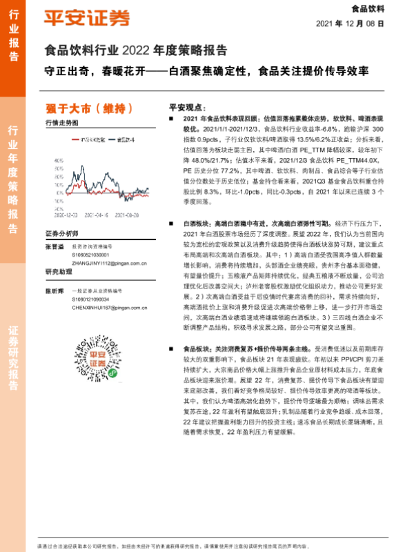 【平安证券】【20211208】食品饮料行业2022年度策略报告:守正出奇,春暖花开——白酒聚焦确定性,食品关注提价传导效率-40页 行业研究
