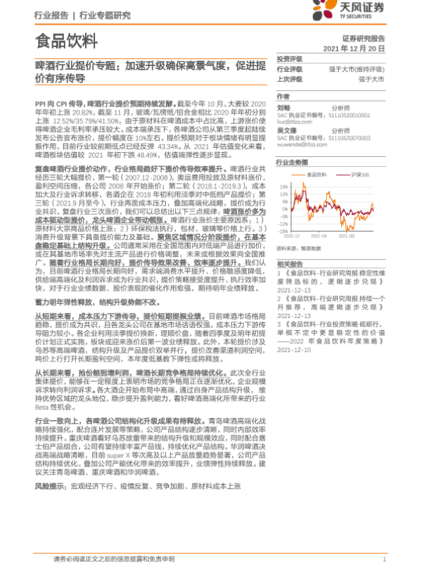 【天风证券】【20211220】食品饮料行业专题研究:啤酒行业提价专题,加速升级确保高景气度,促进提价有序传导-16页 行业研究