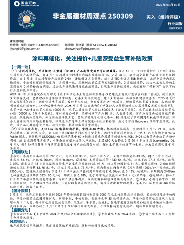 【国金证券】【20250316】20250316-国金证券-非金属建材周观点:涂料再催化,关注提价+儿童漆受益生育补贴政策-21页 行业研究