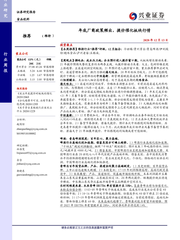 【兴业证券】【20201213】20201213-兴业证券-食品饮料行业周报:年底厂商政策频出,提价催化板块行情-16页 行业研究