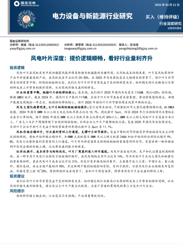 【国金证券】【20250312】2025-03-12-风电叶片深度-提价逻辑顺畅-看好行业量利齐升-15页 行业研究