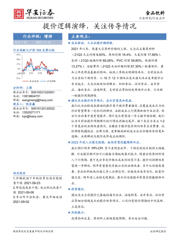 【华安证券】【20211115】食品饮料:提价逻辑演绎,关注传导情况-2页 行业研究