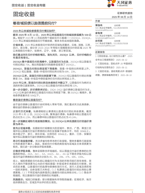 【天风证券】【202508】固定收益专题:哪些城投债以面值提前兑付?-10页 证券期货研究报告
