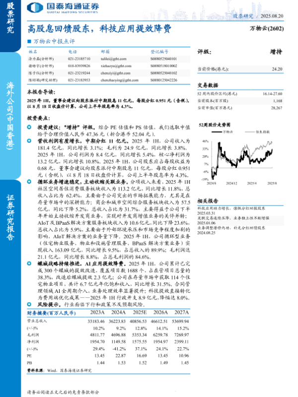 【国泰海通证券】【202508】万物云中报点评:高股息回馈股东,科技应用提效降费-10页 证券期货研究报告