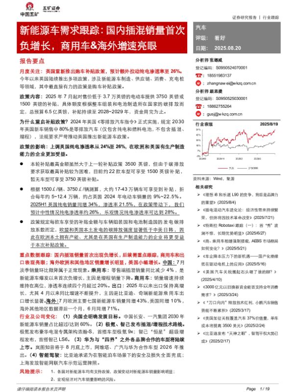 【中国五矿证券】【20250820】新能源车需求跟踪:国内插混销量首次负增长-商用车&海外增速亮眼-19页 证券期货研究报告