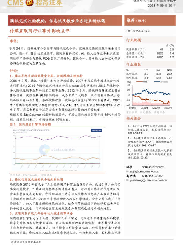 【海通证券】【20210930】传媒互联网行业事件影响点评:腾讯完成收购搜狗,信息流及搜索业务迎来新机遇-3页 证券期货研究报告