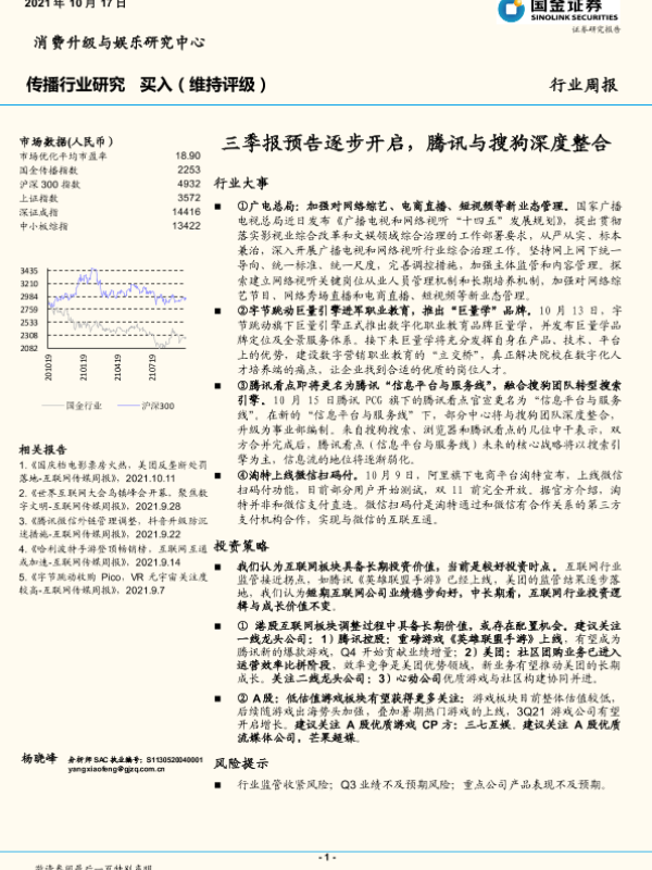 【国金证券】【20211017】传播行业周报:三季报预告逐步开启,腾讯与搜狗深度整合-18页 行业研究