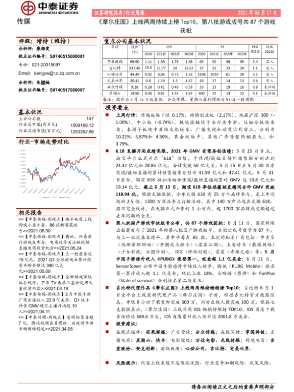 【中泰证券】【20210617】20210617-中泰证券-传媒行业周报:《摩尔庄园》上线两周持续上榜Top10,第八批游戏版号共87个游戏获批-11页 行业研究