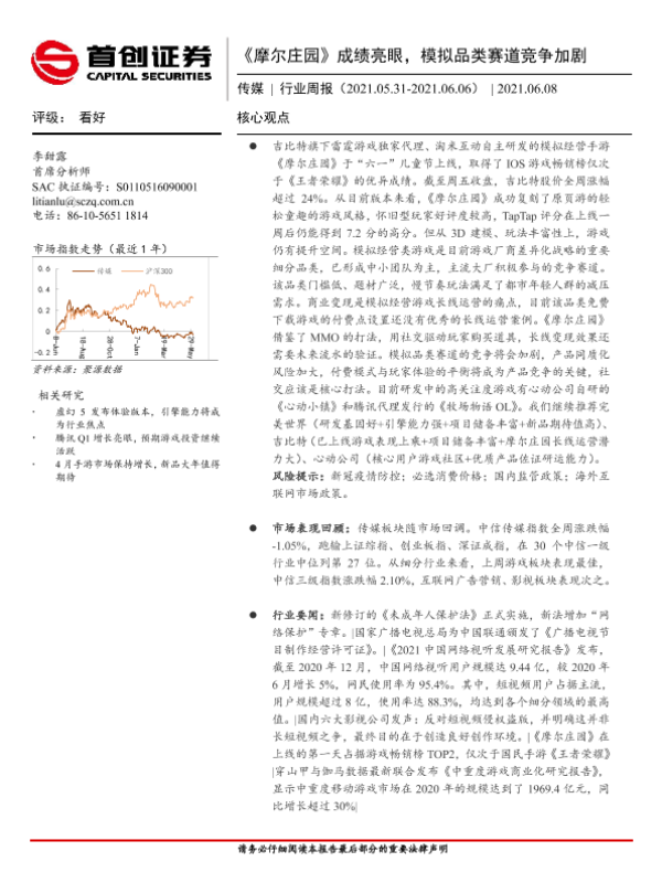 【首创证券】【20210608】20210608-首创证券-传媒行业周报:《摩尔庄园》成绩亮眼,模拟品类赛道竞争加剧-12页 行业研究