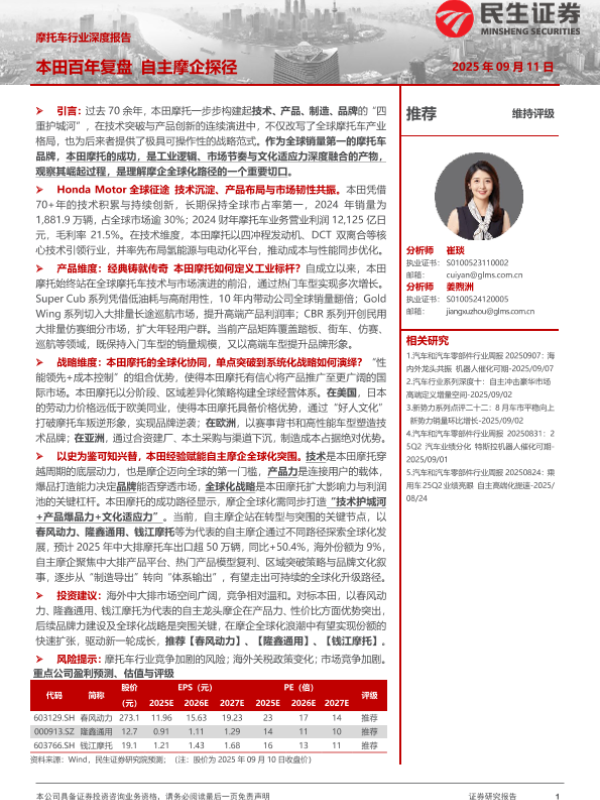 【民生证券】【202509】摩托车行业深度报告:本田百年复盘,自主摩企探径-76页 证券期货研究报告