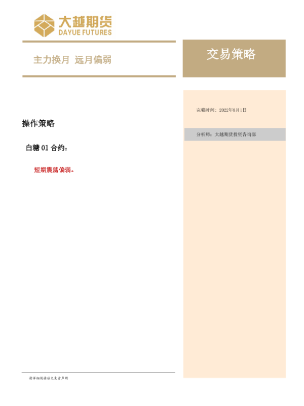 【大越期货】【20220801】白糖交易策略:主力换月,远月偏弱-15页 行业研究