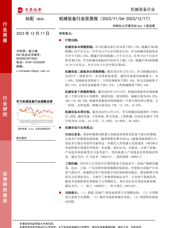 【东莞证券】【20231217】机械设备行业双周报:特斯拉公开擎天柱Gen 2新进展-17页 行业研究