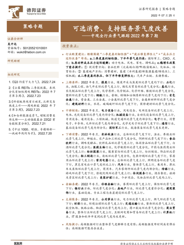 【德邦证券】【20220725】中观全行业景气跟踪2022年第7期:可选消费、支持服务景气度改善-44页 行业研究