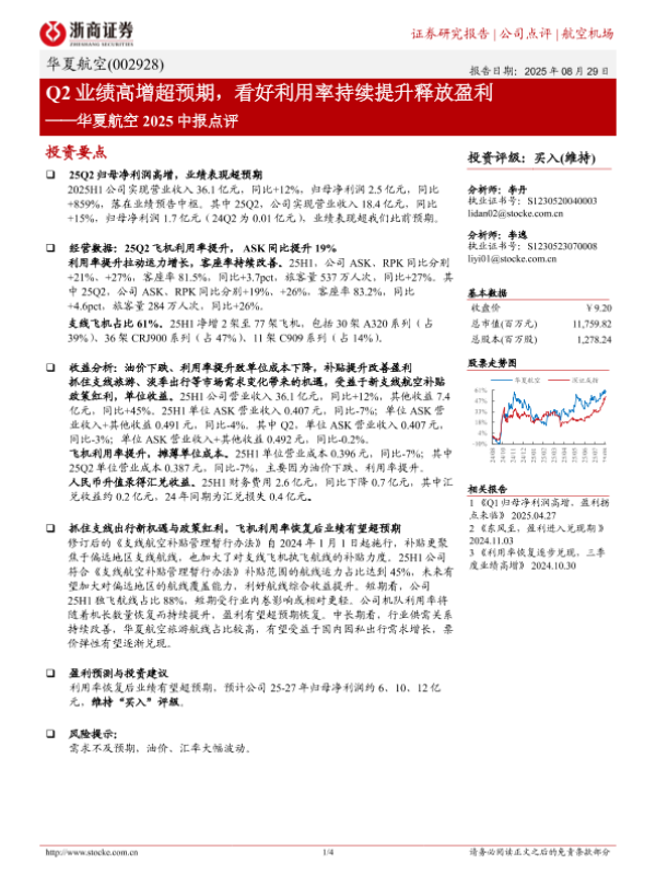 【浙商证券】【20250829】华夏航空-002928.SZ-Q2业绩高增超预期_看好利用率持续提升释放盈利-4页 证券期货研究报告