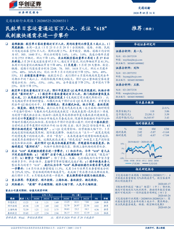 【华创证券】【20200531】交通运输行业周报:民航单日客运量逼近百万人次,关注“618”或刺激快递需求进一步攀升-15页 行业研究