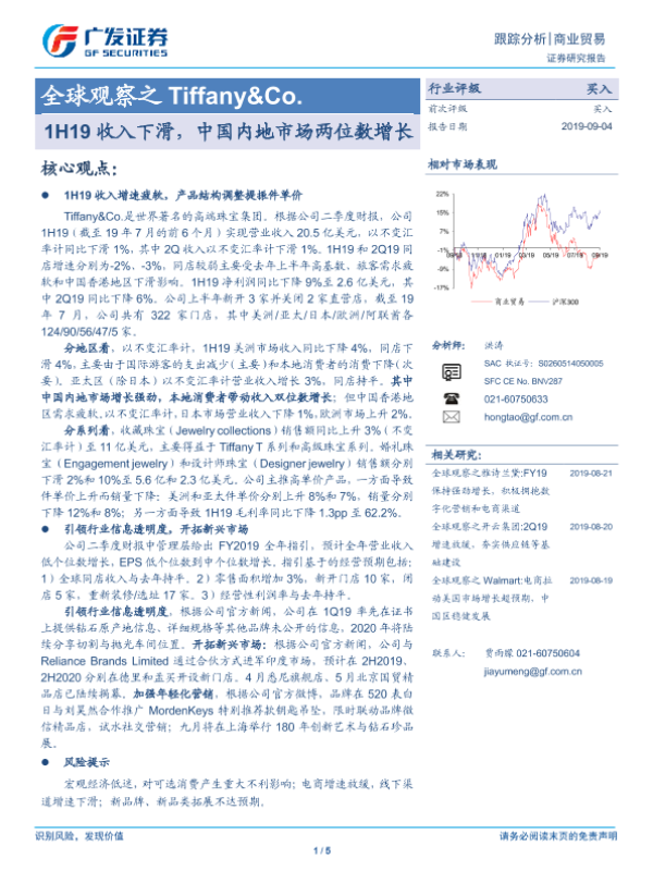 【广发证券】【20190904】全球观察之Tiffany&Co.-1H19收入下滑,中国内地市场两位数增长-5页 行业研究