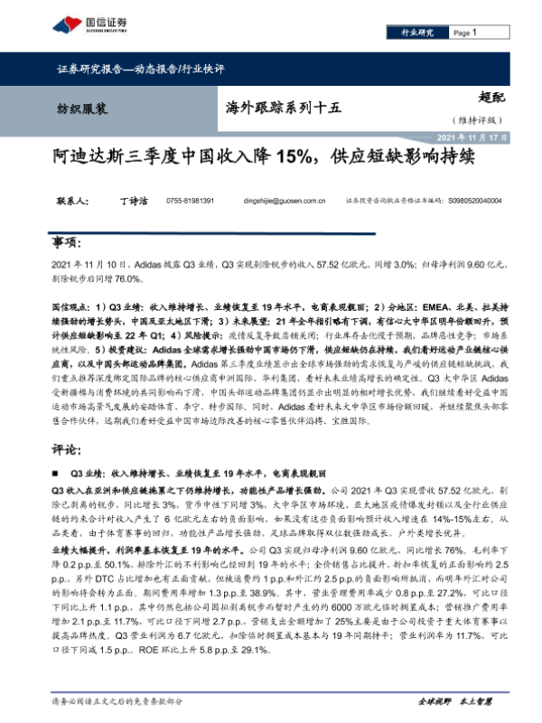 【国信证券】【20211117】纺织服装海外跟踪系列十五:阿迪达斯三季度中国收入降15%,供应短缺影响持续-11页 行业研究