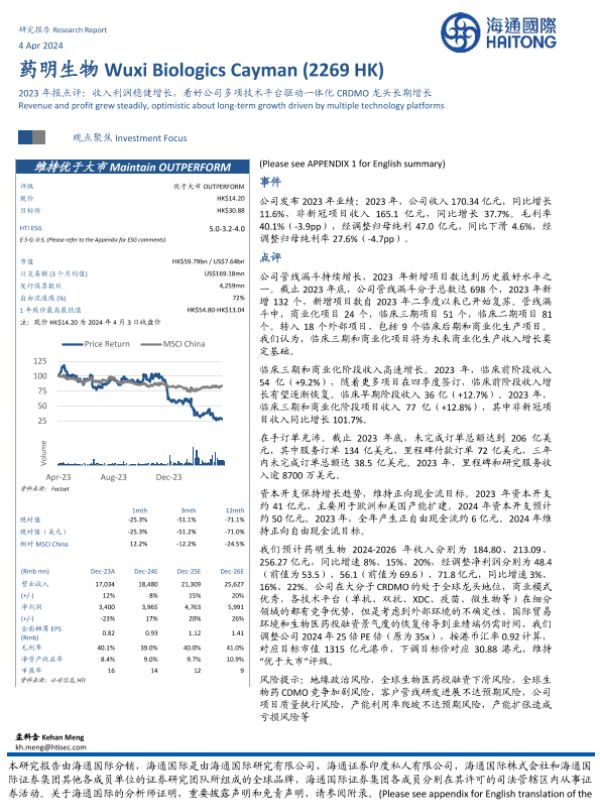 【海通国际】【20240404】药明生物(2269.HK)2023年报点评:收入利润稳健增长,看好公司多项技术平台驱动一体化CRDMO龙头长期增长-14页 行业研究