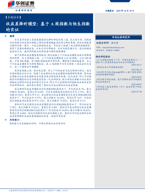 【华创证券】【202510】收益差择时模型:基于A股指数与恒生指数的实证-16页 证券期货研究报告