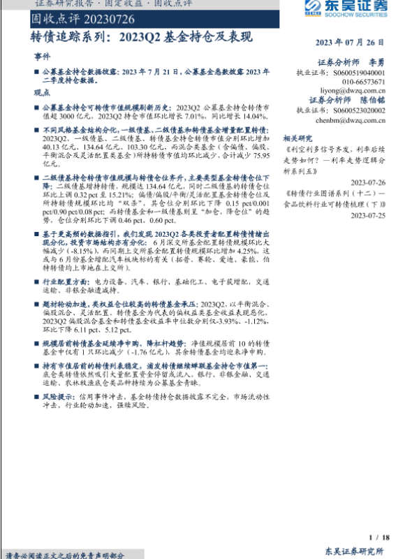 【东吴证券】【20230726】转债追踪系列:2023Q2基金持仓及表现-18页 行业研究