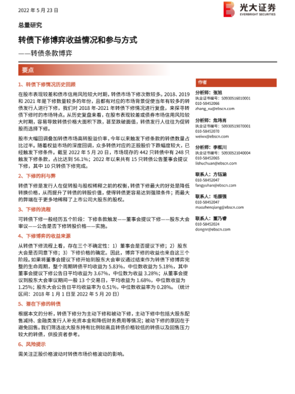 【光大证券】【20220523】转债条款博弈:转债下修博弈收益情况和参与方式-15页 行业研究