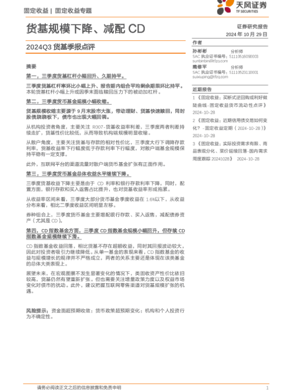 【天风证券】【20241029】2024Q3货基季报点评:货基规模下降、减配CD-10页 行业研究