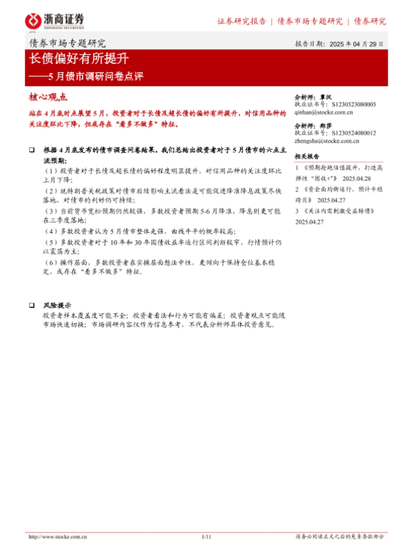 【浙商证券】【20250429】5月债市调研问卷点评:长债偏好有所提升-11页 证券期货研究报告