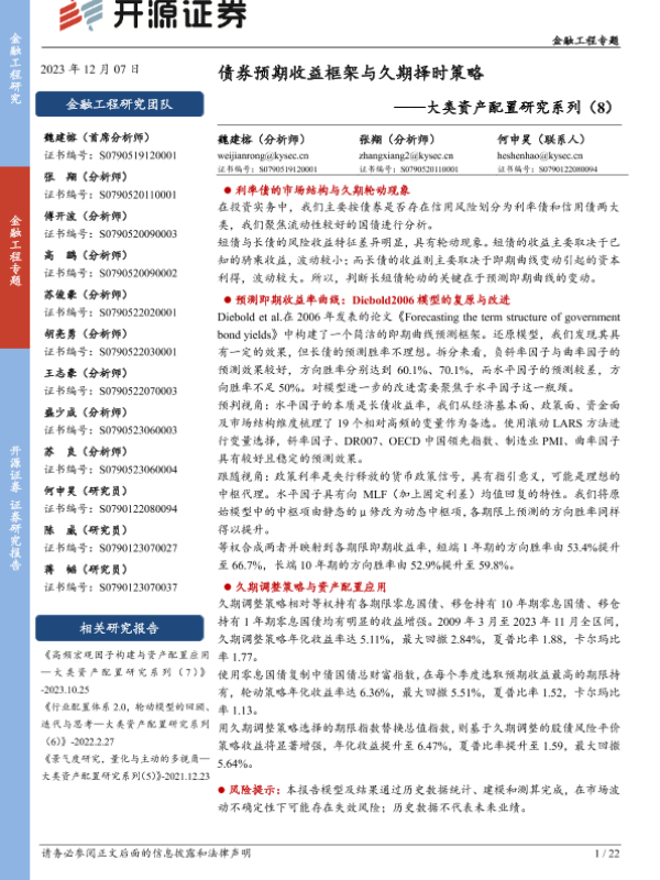 【开源证券】【20231207】大类资产配置研究系列(8):债券预期收益框架与久期择时策略-22页 行业研究