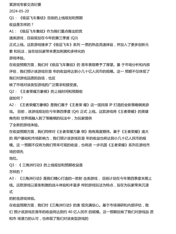 【某游戏公司】【20240520】某游戏专家交流纪要20240520-3页 会议纪要