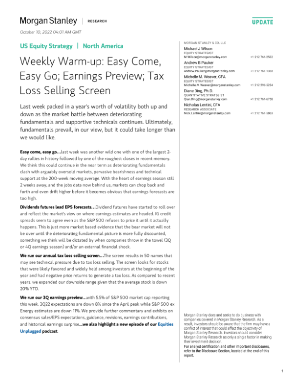 【Morgan Stanley】【20221010】Weekly Warm-up Easy Come, Easy Go; Earnings Preview; Tax Loss Selling Screen-41页 行业研究