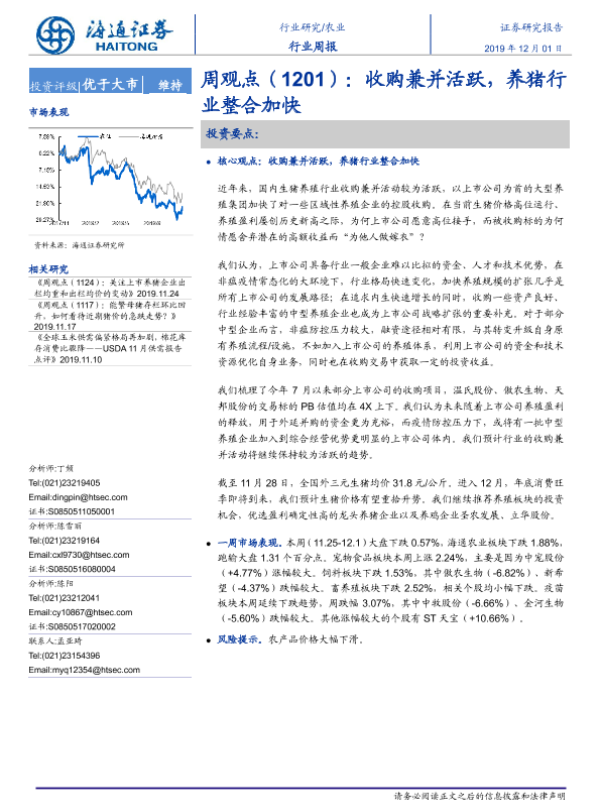 【海通证券】【20191201】农业周观点:收购兼并活跃,养猪行业整合加快-4页 行业研究