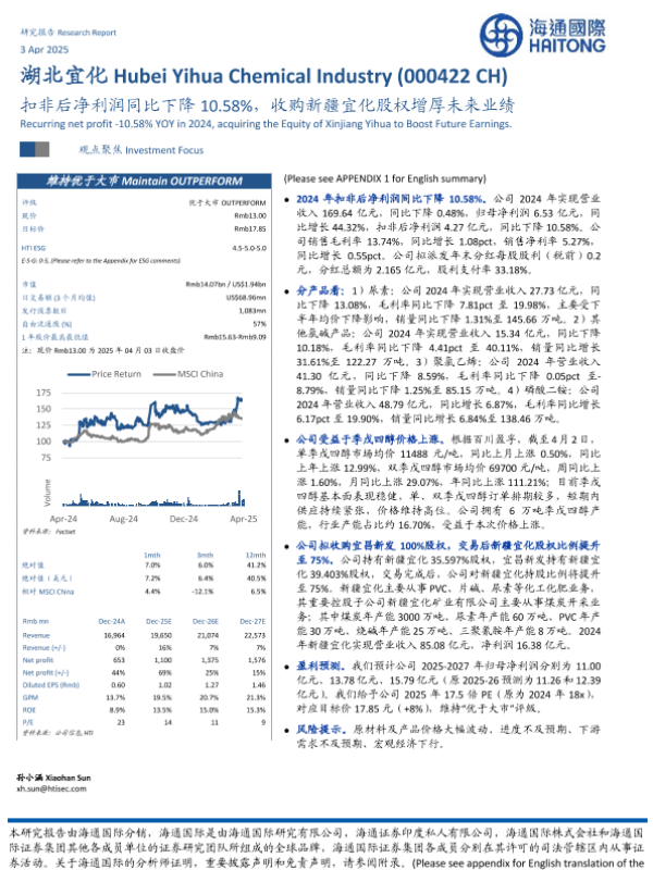 【海通国际】【20250403】湖北宜化扣非后净利润同比下降10.58%,收购新疆宜化股权增厚未来业绩-12页 公司研究