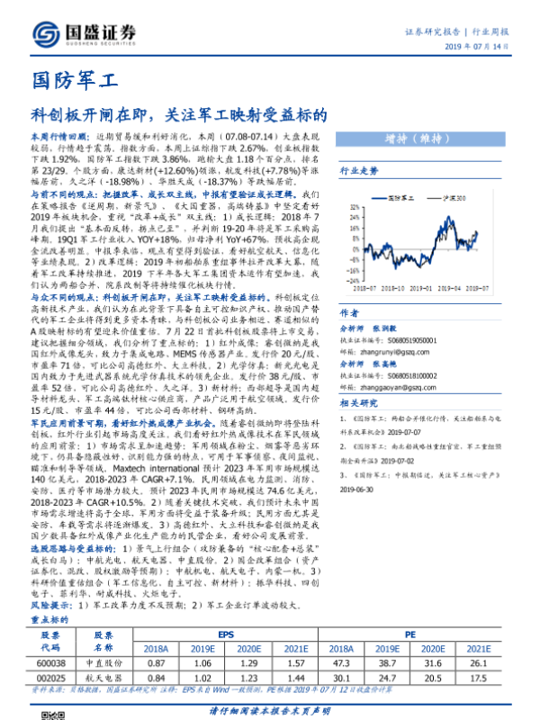 【国盛证券】【20190714】国防军工行业周报:科创板开闸在即,关注军工映射受益标的-18页 行业研究