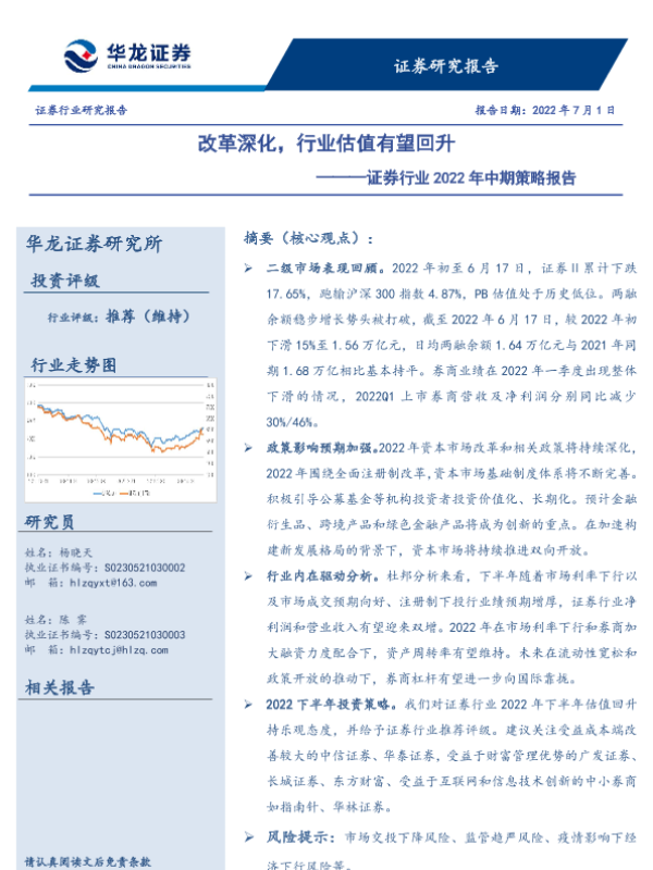 【华龙证券】【20220701】证券行业2022年中期策略报告:改革深化,行业估值有望回升-17页 行业研究