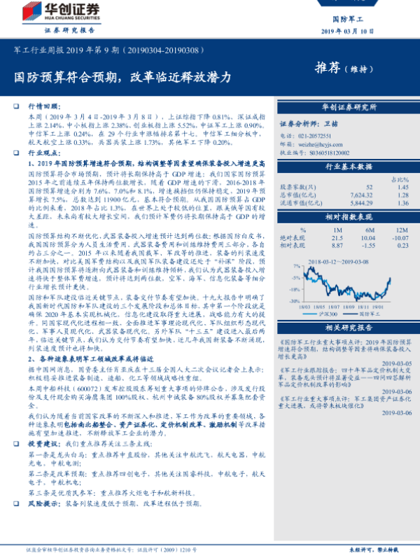 【华创证券】【20190310】军工行业周报2019年第9期:国防预算符合预期,改革临近释放潜力-14页 行业研究