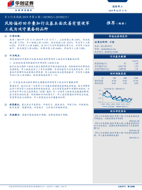 【华创证券】【20190217】军工行业周报2019年第6期:风险偏好回升叠加行业基本面改善有望使军工成为攻守兼备的品种-13页 行业研究