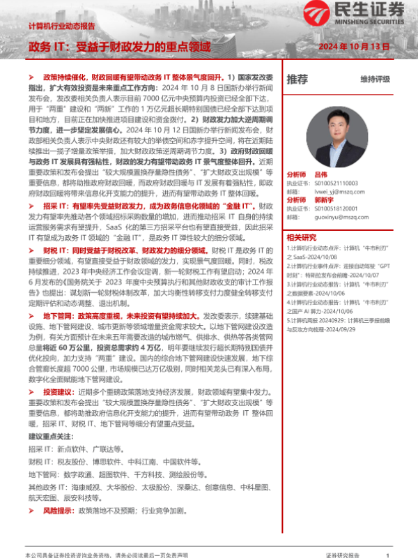 【民生证券】【20241025】计算机行业动态报告:政务IT,受益于财政发力的重点领域-16页 行业研究