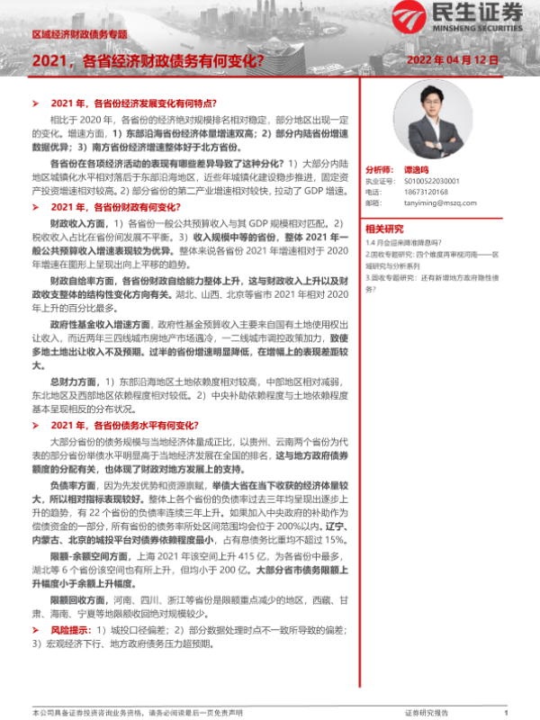 【民生证券】【20220412】区域经济财政债务专题:2021,各省经济财政债务有何变化?-27页 行业研究
