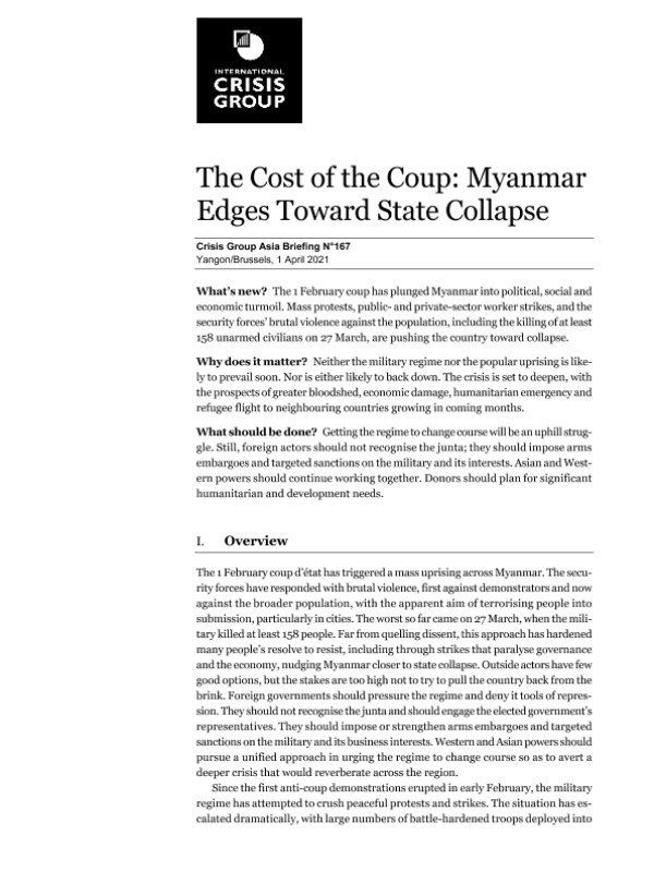 【国际危机组织】【202104】政变的代价:缅甸濒临国家崩溃-20页 行业研究