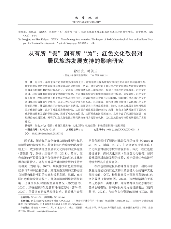 【徐松浚,韩凯云】【2024】从有所“畏”到有所“为”:红色文化敬畏对居民旅游发展支持的影响研究-14页 学术论文