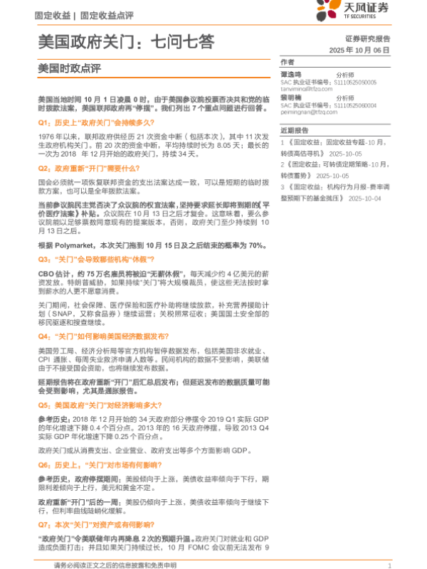 【天风证券】【202510】美国政府关门:七问七答-10页 证券期货研究报告