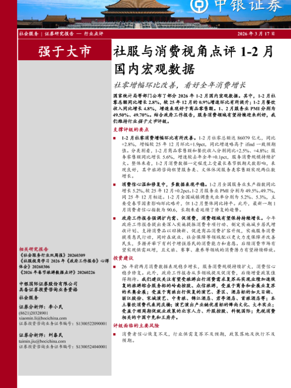 【中银证券】【202603】社服与消费视角点评1-2月国内宏观数据:社零增幅环比改善,看好全年消费增长-6页 证券期货研究报告