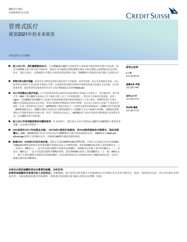 【瑞信】【20210108】美股医疗保健行业管理式医疗:未来一年展望&进入2021年的首要问题-29页 行业研究