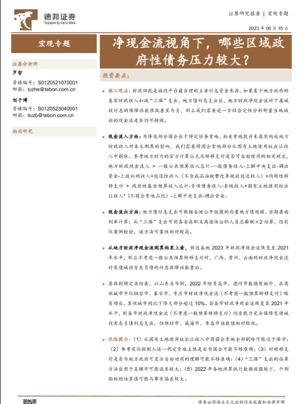 【德邦证券】【20230615】宏观专题:净现金流视角下,哪些区域政府性债务压力较大?-18页 行业研究